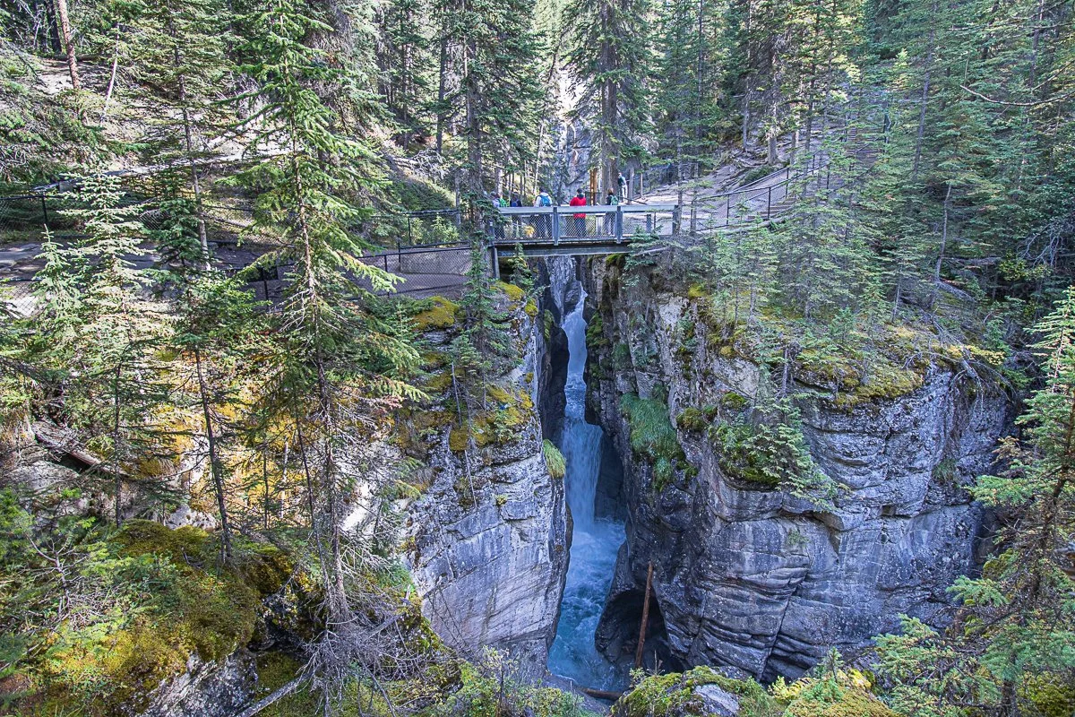 Notre premier jour entier sur place sera consacré à la visite du canyon de Maligne qui est le canyon le plus profond du parc national de Jasper allant jusqu’à 50 mètres de profondeur ! J’ai parfois eu du mal à regarder en bas tellement c’était vertigineux! En hiver, le canyon se transforme, il est possible de marcher dans celui-ci sur la rivière gelée. Nous aurons peut-être l’occasion de nous y aventurer pour une prochaine visite.